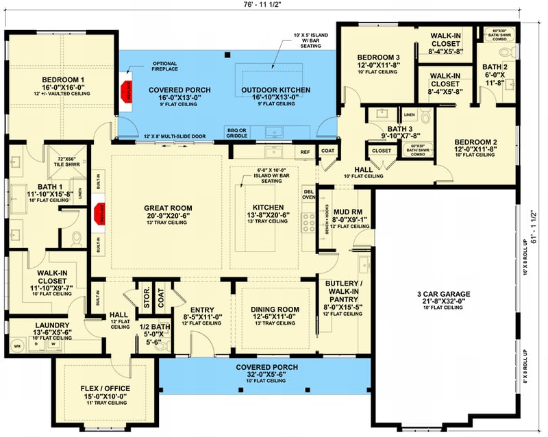 Plan 421037WNT: Transitional Modern Farmhouse House Plan with 3-Car Garage, Home Office and Outdoor Kitchen - Floor Plan - Main Level - Country, Craftsman, Modern Farmhouse, Transitional